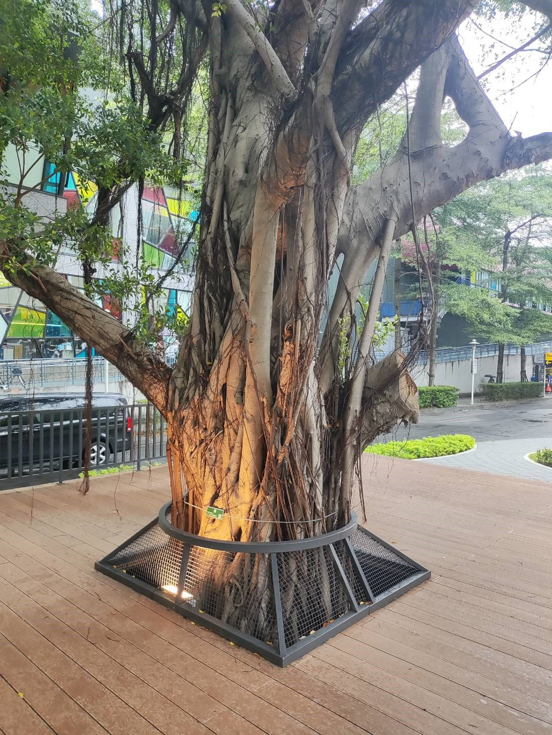 場館旁的榕樹群,於底部增添由樹根部向上照明的投射燈,讓原本曾讓觀眾不敢駐足經過的視線治安死角,搭配上重新鋪建的木棧板步道,成為了別具特色的遊憩場地。