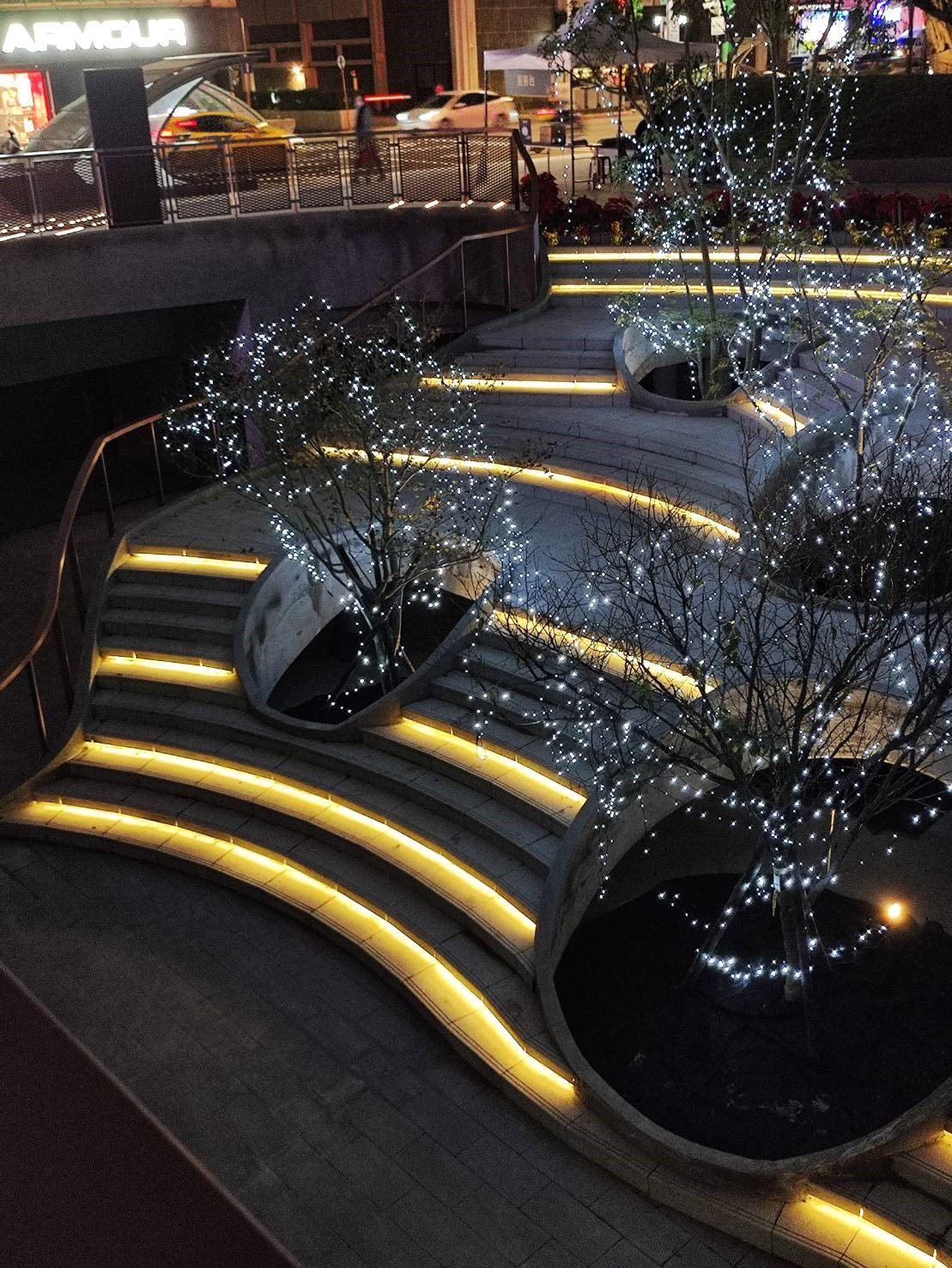 場館外的走道及階梯部分,安裝於階梯底部的LED燈條,不僅在夜間時為視覺增添了層次感,也讓上下樓梯時引導注意階距,使質感與安全性兼具。